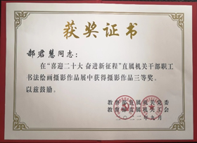 經(jīng)過(guò)專(zhuān)家評審,我公司產(chǎn)教融合部郝君慧同志獲得攝影類(lèi)“三等獎”,作品在教育部展廳進(jìn)行了展出。